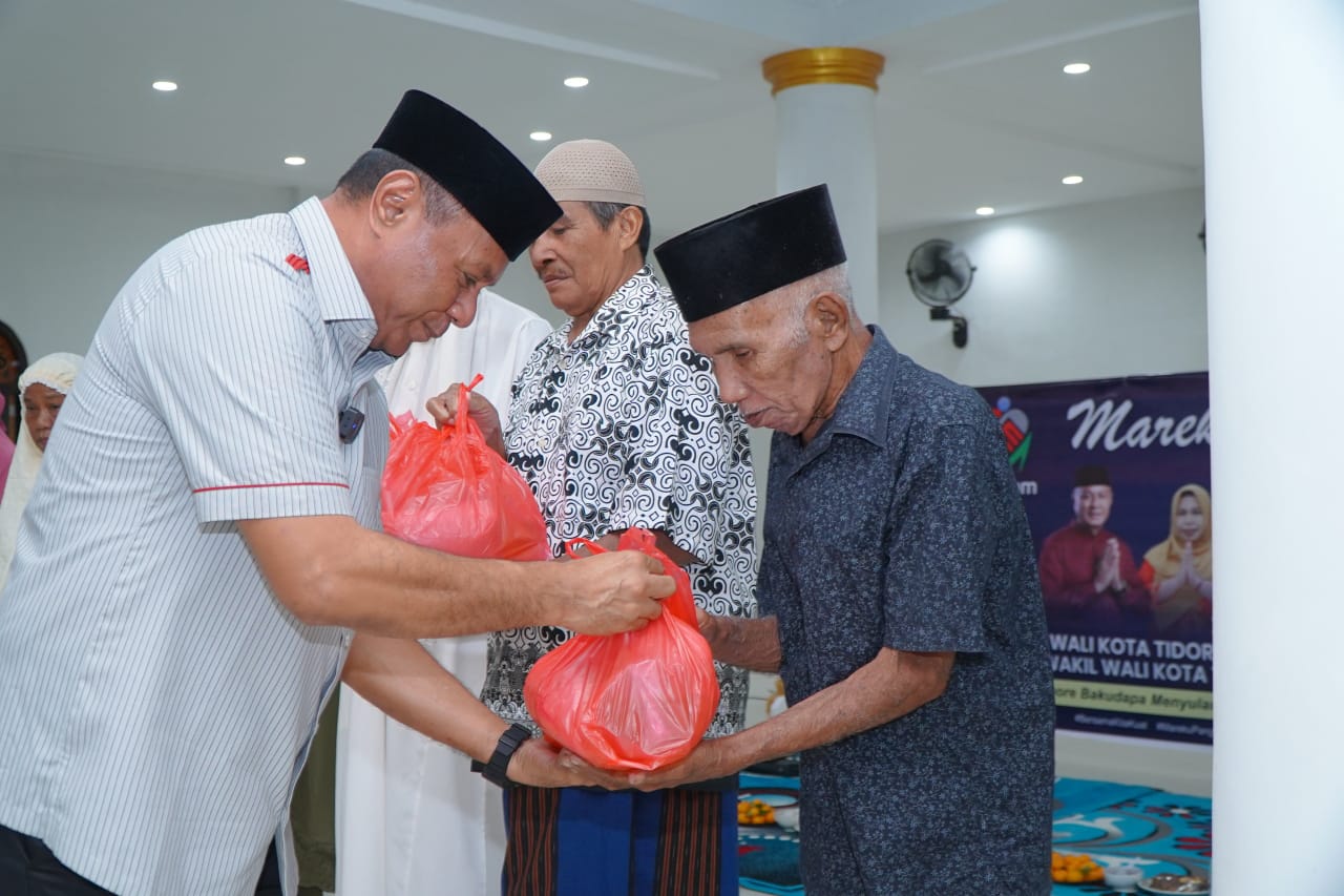 Sofifipost, Tidore | Wali Kota Tidore Kepulauan Muhammad Sinen dan Ketua TP PKK Kota Tidore Kepulauan Hj. Rahmawati Muhammad menyerahkan ratusan paket sembako kepada yang berhak menerima dalam kegiatan Mareku Berbagi. Salah satu rangkaian acara Raro Gam di Masjid Al Mujahiddin Kelurahan Mareku, Kecamatan Tidore Utara, Minggu (16/3/2025) malam.