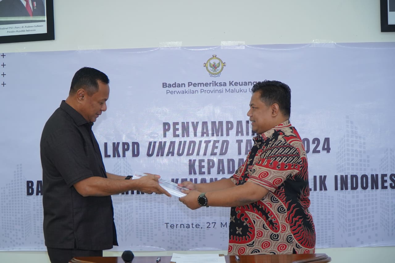 Penyerahan LKPD Kota Tidore Kepulauan TA 2024 Unaudited diterima langsung oleh Kepala Bidang Pemeriksaan I BPK Perwakilan Provinsi Maluku Utara Bhuwono Agung Nugroho, Jumat (21/3/2025).