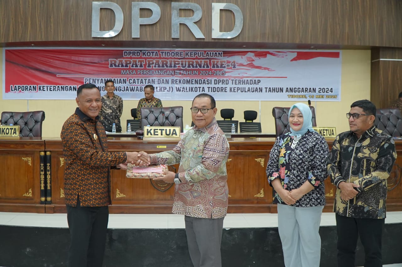 Sofifipost, Tidore | DPRD Kota Tidore Kepulauan resmi sampaikan catatan dan rekomendasi terhadap Laporan Keterangan Pertanggungjawaban (LKPJ) Wali Kota Tidore Kepulauan Tahun Anggaran 2024 dalam rapat Paripurna ke-4 masa persidangan III tahun 2024-2025, yang dihadiri oleh Wali Kota Tidore Kepulauan Muhammad Sinen, Kamis (15/5/2025).