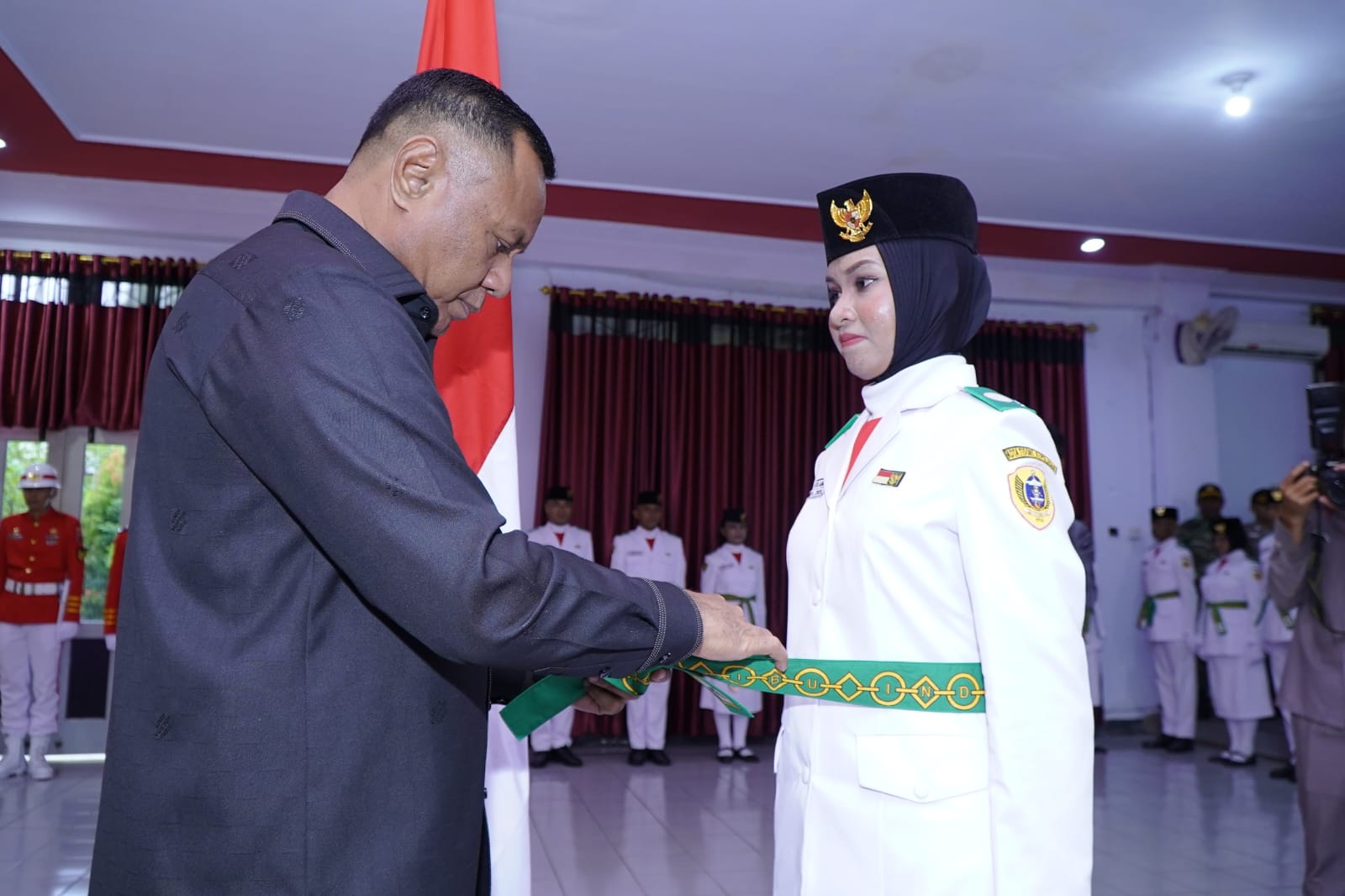 Pembawa baki Lencana dan Kendit Najwa Febriani Purna Paskibraka Kota Tidore, Dirigent Humaira A. Yusuf Calon Anggota Paskibraka Kota Tidore asal sekolah SMA Negeri 1 Kota Tidore Kepulauan dan pembawa acara dari Bagian Protokol dan Komunikasi Pimpinan Setda Kota Tidore Kepulauan.