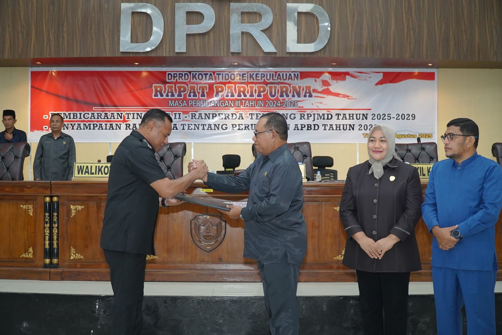 Persetujuan tersebut diagendakan pada Rapat paripurna ke-13 masa persidangan III tentang pembicaraan tingkat II Ranperda RPJMD Kota Tidore Tahun 2025-2025 yang dipimpin langsung Ketua DPRD Ade Kama, yang berlangsung di ruang rapat Paripurna DPRD, Rabu (20/8/2025).